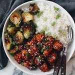 - Serve: Serve the sweet chili chicken and Brussels sprouts hot alongside rice. Garnish with sesame seeds and lime wedges, and offer extra sweet chili sauce if desired.