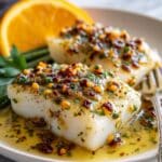 Arrange the baked cod fillets on serving plates and generously drizzle with the vibrant orange beurre blanc sauce. Garnish with fresh parsley or chives to add a fresh herbal note and a burst of color. Your Baked Cod with Orange Beurre Blanc Recipe is ready to impress!