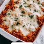 Transfer the entire spaghetti mixture to a 2-quart casserole dish or a standard 9×13-inch baking pan. Spread it out evenly so every bite offers gooey delight. Sprinkle the remaining shredded cheese evenly on top creating that inviting golden layer you’re aiming for.