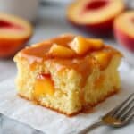 Absolutely! If fresh peaches aren’t available, well-drained canned peaches work fine. Just be sure to pat them dry to avoid extra moisture muddling the cake texture.