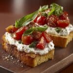 This bruschetta works beautifully as an appetizer or part of a Mediterranean-style spread. Pair it with crisp green salads, grilled vegetables, or charcuterie boards to create a feast that’s both vibrant and inviting.