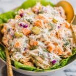 This dish is best served cold or at room temperature. If you want to warm it up slightly, try serving it alongside warm bread, but avoid microwaving the salad itself to maintain its creamy texture and fresh ingredients.