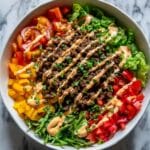 This Cheeseburger Bowl recipe offers a flavorful, low-carb alternative to the classic cheeseburger. Ground beef seasoned with garlic, onion powder, and smoked paprika is cooked to juicy perfection and layered over a fresh bed of romaine lettuce. Topped with cheddar cheese, cherry tomatoes, dill pickles, and an optional tangy cheeseburger sauce, this bowl captures all the delicious components of a cheeseburger without the bun. Ready in just 20 minutes, it’s a quick, satisfying meal perfect for lunch or dinner.