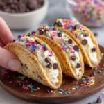 Elevate your cheesecake cookie dough tacos with fun, eye-catching garnishes that add flavor and visual appeal. Sprinkles bring a playful pop of color, chocolate chips double down on the chocolate love, crushed cookies add crunch, and a drizzle of caramel or even a dusting of cocoa powder or powdered sugar can take these treats to next-level show-stoppers. Don’t be shy—make your toppings as bold or as subtle as you like.