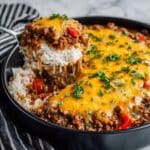 - Add Cheese: Evenly sprinkle shredded cheese over the cooked rice and beef mixture. Cover again and cook for an additional 5 minutes or until the cheese has fully melted and is gooey.