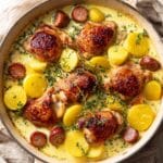 - Plate and serve: For each serving, place a chicken thigh and a sausage on the plate along with a generous portion of the cooked vegetables and potatoes. Spoon the flavorful cooking liquid over the top. Serve alongside crusty bread or freshly cooked linguine pasta for a complete meal.