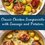 Chicken Scarpariello is a classic Italian-American dish featuring succulent bone-in chicken thighs and flavorful Italian sausages baked in a vibrant sauce of onions, bell peppers, garlic, pickled peppers, white wine, and aromatic rosemary. The dish is finished in the oven with hearty gold potatoes, making it a comforting and well-rounded meal perfect for serving with crusty bread or pasta.
