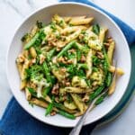 This Chicken Vegetable Penne with Parsley Walnut Pesto Recipe pairs wonderfully with a crisp green salad dressed in a bright vinaigrette to contrast the rich pesto. Garlic bread or a warm crusty loaf is also a perfect companion to mop up every last bit of the pesto-coated pasta.