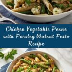 A wholesome and flavorful Chicken Vegetable Penne with Parsley Walnut Pesto, featuring tender chicken, vibrant vegetables, and a fresh herbaceous pesto made from parsley and toasted walnuts. This Italian-inspired dish is perfect for a healthy and satisfying weeknight dinner.