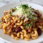 This Chili Mac and Cheese combines hearty elbow macaroni with a flavorful mix of ground beef, kidney beans, and a blend of chili spices, all topped with melted cheddar cheese for a comforting and satisfying meal perfect for any day of the week.