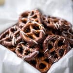 Mini pretzels are ideal because they are the perfect size for dipping and snacking. Large pretzels work too but may require more chocolate and longer setting time.