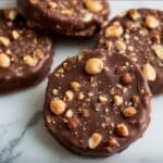 - Coat the Cookies: In a microwave-safe bowl, melt the chopped chocolate along with the optional coconut oil or shortening in 30-second intervals. Stir well between each interval to ensure a smooth, even melt without burning the chocolate. Once fully melted and glossy, dip each cooled cookie into the chocolate, making sure it is fully coated. Place the dipped cookies on a wire rack or parchment paper to set. Immediately sprinkle each cookie with the reserved finely chopped hazelnuts while the chocolate is still wet. Allow the chocolate coating to set completely at room temperature or speed up the process by placing the cookies in the refrigerator until firm.