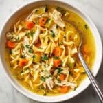 When you’re ready to enjoy your leftovers or thawed frozen soup, reheat gently on the stovetop over medium-low heat. If the soup feels thick, add a splash of water or broth to loosen the consistency. Add fresh noodles then let them cook through during reheating for that freshly made feel.