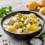 This creamy garlic sauce baby potatoes recipe features perfectly roasted baby potatoes tossed in a luscious garlic-infused cream sauce with Parmesan cheese and a hint of lemon. It’s an easy, comforting side dish that elevates simple potatoes into a flavorful treat.