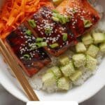 - Assemble Bowls: Divide the cooked rice evenly between four bowls. Arrange shredded carrots, cucumber slices, and sliced avocado over the rice, then top each with a baked salmon fillet.