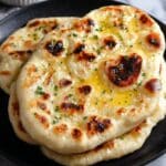 If you happen to have any naan left over, wrap them tightly in plastic wrap or store in an airtight container at room temperature for up to 2 days. You’ll want to gently warm them before serving to bring back that freshly made softness.