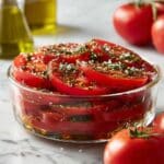 This Easy Marinated Tomatoes Recipe pairs beautifully with grilled chicken, seafood, or steak—adding fresh acidity and sweetness to balance smoky or rich flavors. It’s also fantastic served alongside crusty bread, fresh mozzarella, or a light grain salad, turning any meal into a fresh celebration of simple ingredients.