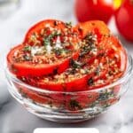 Take a fun twist by layering the marinated tomatoes over a bed of creamy burrata or dollops of whipped ricotta. You can also serve them stacked with slices of avocado for a colorful salad or spoon them into warm pita pockets with grilled veggies for an easy Mediterranean-style wrap.