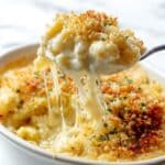 Allow your Four Cheese Baked Macaroni Recipe to cool for about 5 to 10 minutes before serving. This resting time helps the sauce set, making it easier to serve and elevating the comfort-factor with every bite.