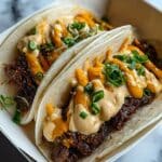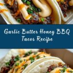 These Garlic Butter Honey BBQ Tacos combine tender seasoned ground beef with a sweet and smoky honey BBQ sauce, topped with a creamy homemade taco sauce, cheddar cheese, and fresh cilantro, all wrapped in soft tortillas. Perfect for a quick and flavorful weeknight meal.