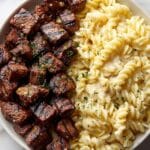 This delicious recipe features tender garlic butter steak bites paired with cheesy Alfredo pasta twists, creating a rich and satisfying meal that comes together in just 25 minutes. Perfect for a comforting weeknight dinner, the savory steak is cooked to perfection and combined with creamy Alfredo sauce and melted mozzarella for an irresistible blend of flavors.