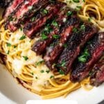 Add your cooked noodles to the skillet and toss gently, ensuring every strand is thoroughly coated with the flavorful garlic butter sauce. This is where the noodles soak up the vibrant flavors and transform into a truly comforting base for the steak.