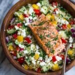This Greek Salmon Quinoa Salad is a vibrant and nutritious dish combining perfectly baked salmon with fluffy quinoa and fresh Mediterranean vegetables. Tossed with tangy lemon juice, olives, and crumbled feta, it’s a deliciously healthy meal that’s ready in just 35 minutes, perfect for a light lunch or dinner.
