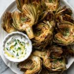 For a stunning presentation, serve the artichokes halved or quartered with the aioli in a rustic small bowl at the center. You can also assemble a platter with the artichoke pieces laid out like petals, perfect for sharing. They make an impressive appetizer or finger food at any gathering.