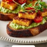 This recipe includes halloumi cheese and honey, which are animal products, so it’s not vegan. For a vegan twist, consider using a plant-based cheese and a drizzle of maple syrup instead of honey.