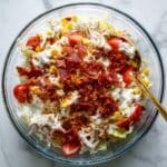 Italian Grinder Chicken Salad combines tender shredded chicken breast with savory salami, tangy pepperoncini, fresh cherry tomatoes, and crisp romaine lettuce, all tossed in a creamy, zesty dressing made with mayonnaise, red wine vinegar, and Dijon mustard. This no-cook, flavorful salad captures the essence of a classic Italian grinder sandwich in an easy-to-make, protein-packed salad perfect for a light lunch or dinner.