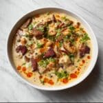 Jambalaya Alfredo is a flavorful fusion dish combining the rich, creamy texture of classic Alfredo pasta with the bold, spicy flavors of Cajun jambalaya. Featuring andouille sausage, chicken, and shrimp cooked with bell peppers, onion, and garlic, all tossed in a luscious Parmesan cream sauce over tender fettuccine or penne pasta, this dish is a satisfying main course perfect for lovers of Southern-inspired cuisine with a creamy twist.