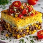 This Jiffy Cornbread Taco Bake combines the comforting texture of cornbread with savory seasoned ground beef, enchilada sauce, and a creamy cheesy topping, creating an easy-to-make, flavorful dish perfect for family dinners or gatherings. Loaded with Tex-Mex flavors and topped with fresh veggies, it bakes to golden perfection in under an hour.