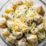 Leftovers of this Lemony Chive Potato Salad with Parmesan Recipe can be stored tightly covered in the refrigerator for up to three days. The flavors only deepen over time, so it often tastes even more delicious the next day.