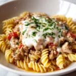 Finish your Loaded Cheeseburger Alfredo Pasta Recipe with fresh toppings: sprinkle chopped pickles, crispy bacon bits, and fresh parsley on top just before serving. These garnishes add that final unforgettable crunch, tang, and color that turn this dish into pure comfort food bliss.