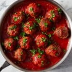 Reheat leftovers gently in a skillet over low heat or in the microwave until heated through. Adding a splash of water or extra sauce during reheating helps keep the meatballs juicy and the sauce glossy.