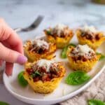 Bake your nests in the oven for 15 to 20 minutes, or until the cheese is melted, bubbly, and lightly browned, and the edges of the spaghetti start getting crispy. Once out of the oven, let them cool for about 5 minutes, then carefully lift them out of the muffin tin. This gentle resting time helps the nests firm up, so they keep their shape beautifully.