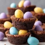 6. Add Topping and Finish Baking: Remove the muffin tins from the oven and carefully press the remaining ½ cup of whole mini chocolate eggs into the tops of each brownie bite. Return to the oven and bake an additional 3 minutes to set the toppers.
