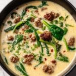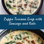 A hearty and creamy Italian-American soup inspired by Olive Garden’s famous Zuppa Toscana, featuring spicy Italian sausage, tender potatoes, kale, and a rich blend of chicken broth and heavy cream, all topped with crispy bacon crumbles.