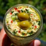 - Transfer and Garnish: Spoon the dip into a serving jar or bowl. Drizzle a little olive oil on top and place two whole green olives as an optional decorative and flavorful topping.