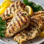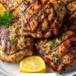 Fresh lemon slices and a sprinkle of chopped parsley or oregano perfectly complement the chicken’s vibrant flavors, adding a pop of color and a fresh burst of aroma that invites you to dig in.