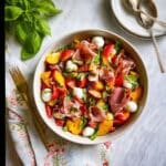 This refreshing Peach Caprese Salad combines juicy peaches and ripe roma tomatoes with creamy mozzarella balls, fresh basil, and a tangy olive oil and vinegar dressing. Topped with optional prosciutto and a drizzle of balsamic glaze, this salad is perfect as a light meal or a flavorful side dish, ready in just 15 minutes.