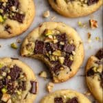 These Pistachio Cookies are a deliciously nutty and chocolatey treat with a perfect balance of chewy and crispy textures. Made with finely ground pistachios incorporated into the dough and studded with chopped dark chocolate and extra pistachios, these cookies are topped with flaky sea salt for a gourmet touch. Simple to prepare and baked to perfection, they make a delightful snack or dessert for any occasion.
