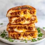 Once your pancakes and beef topping are hot and ready, place several pancakes on a plate. Spoon a generous amount of the beef mixture over each one, then immediately sprinkle shredded sharp cheddar cheese on top so it melts into gooey goodness. Garnish with fresh parsley if you like for a burst of color and brightness.