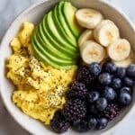 3. Assemble the bowl: If using, place cooked quinoa or brown rice at the base of each bowl. Then add scrambled eggs, followed by avocado slices and fresh mixed berries on top.