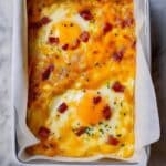 Sprinkle salt and pepper generously over the eggs to enhance all the flavors. Then evenly scatter 1 ½ cups of freshly grated cheese over the eggs followed by diced bacon pieces. This layering creates that irresistible combination of creamy, salty, and smoky flavors.