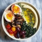 A flavorful and nourishing savory breakfast bowl featuring sautéed mushrooms, cherry tomatoes, and spinach topped with perfectly cooked eggs and creamy hummus. This easy 20-minute recipe offers a balanced combination of vegetables, protein, and healthy fats, making it an ideal way to start your day.