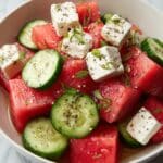 A refreshing and easy-to-make watermelon cucumber feta salad that combines juicy watermelon, crisp cucumber, tangy feta cheese, and fresh mint, dressed with a zesty olive oil and lime dressing. Perfect for a light summer appetizer or side dish.