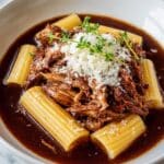 While the beef is slow cooking, bring a large pot of salted water to boil and cook the rigatoni according to the package instructions until just al dente. The ridged tubes will soak up the sauce beautifully, so aim for that perfect bite that isn’t too soft but still tender.