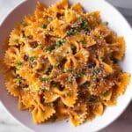 Bright fresh herbs like parsley or basil are perfect for garnishing this Spicy Shallot Pasta Recipe because they add a lovely herbal contrast to the rich and spicy sauce. You could also sprinkle a little extra freshly grated Parmesan on top for that cheesy flourish.