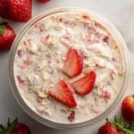 This recipe is best enjoyed chilled, but if you prefer a warm version, gently heat the oats in a microwave-safe bowl for about 30 seconds. Stir well and add a splash of milk if needed to loosen the texture. Top with fresh strawberries for that classic strawberries and cream vibe.